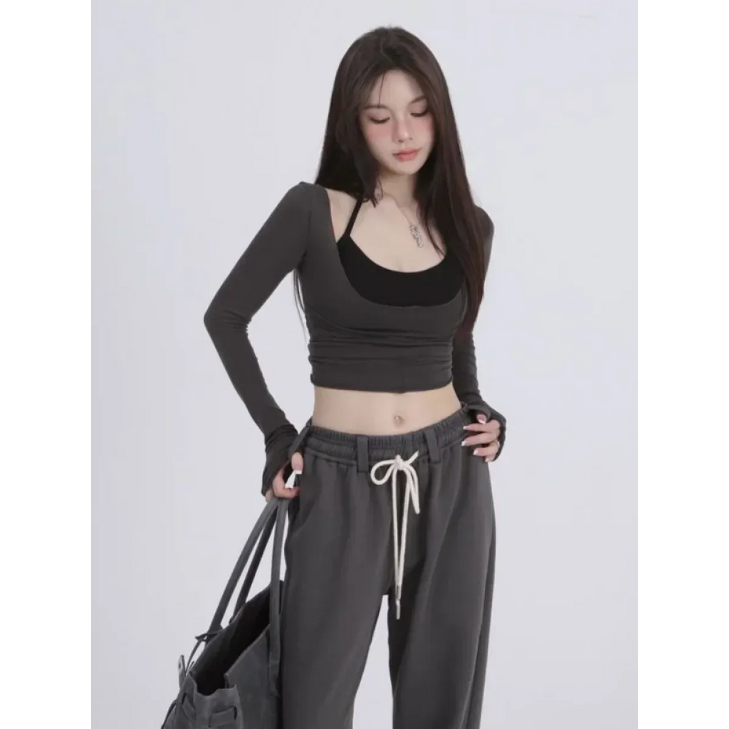 👗 Styling Tip: Maximize the street style by pairing this two-piece set with high-waisted jeans or a mini skirt. Layer the long sleeve tee under the halter for a dynamic, textured look, or wear the halter alone on warmer days. Accessorize with chunky sneakers and a statement backpack to complete the Harajuku vibe.