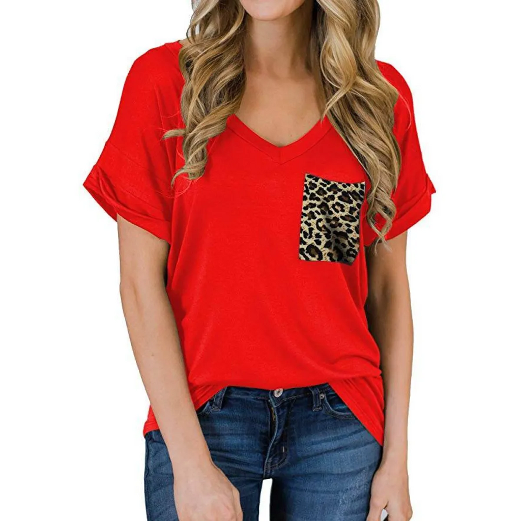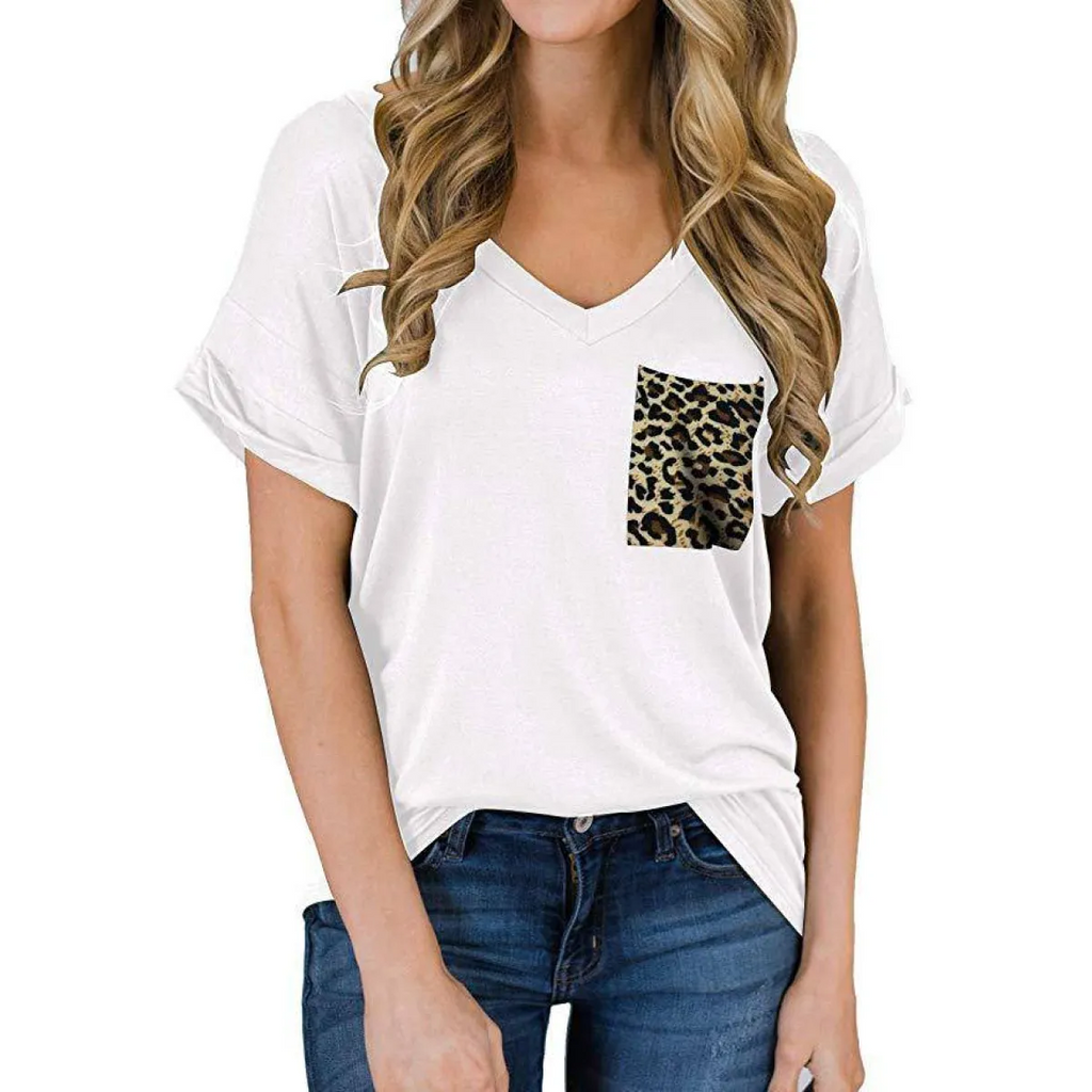 - Feature: Short sleeve, leopard print, patchwork, top, women's clothes