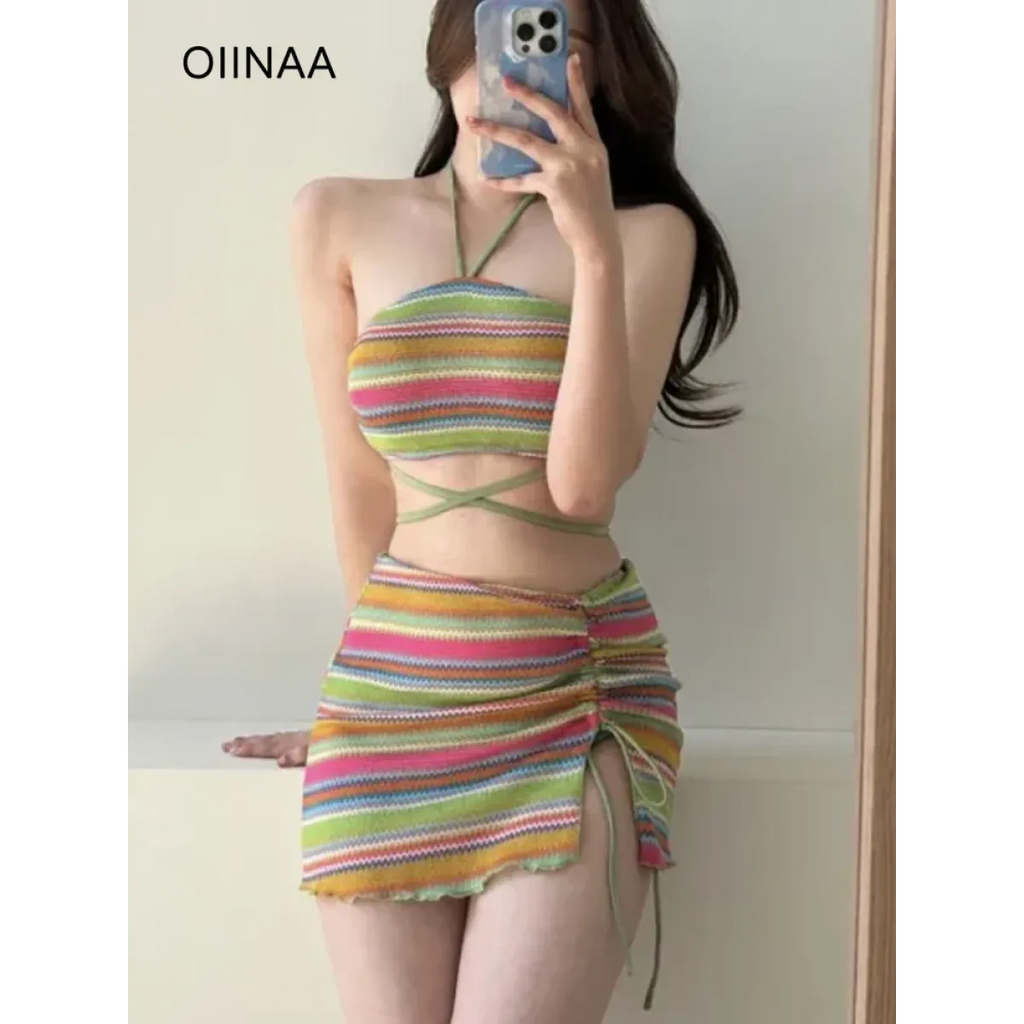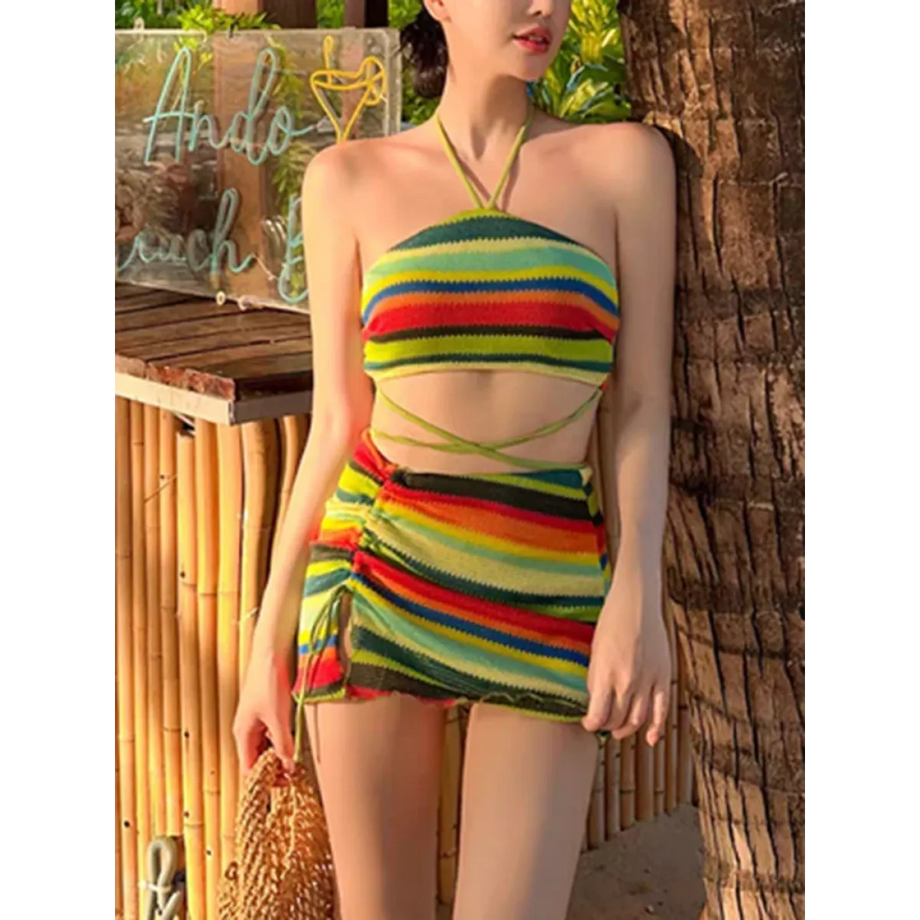 This colorful bikini set boasts a bold block-stripe design and a flattering high-waisted drawstring skirt that channels Korean pop fashion with a spicy twist. Whether lounging by the pool or dancing in the waves, you’ll feel confident, comfy, and super cute.