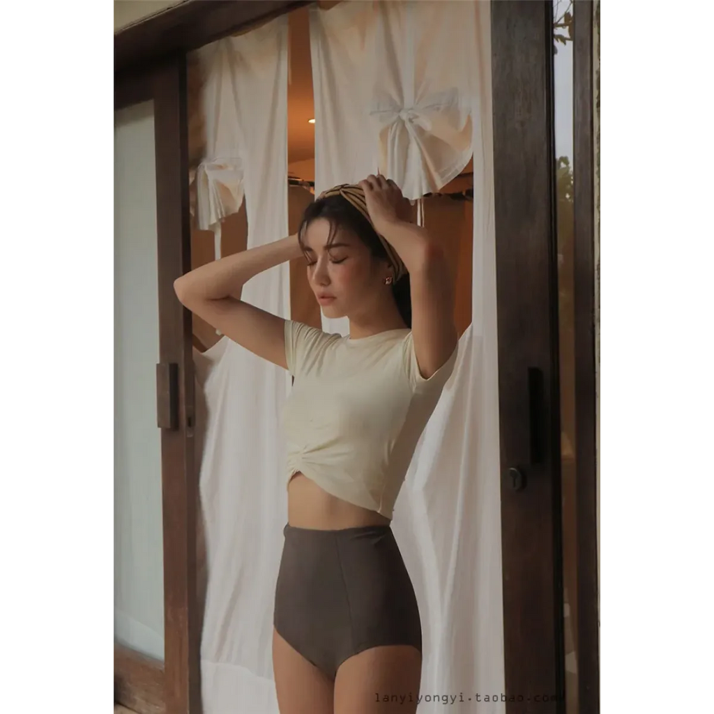 This stylish bikini set blends Korean fashion influence with practical elegance—featuring a ruched, short-sleeve top and flattering high-waisted bottoms for a modest yet modern vibe. Whether you're soaking up sunshine or relaxing in hot springs, you'll turn heads with effortless grace.
