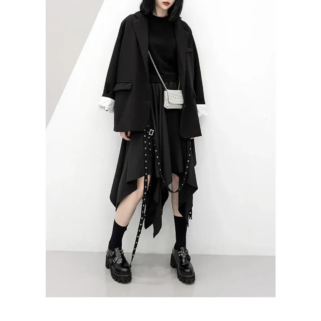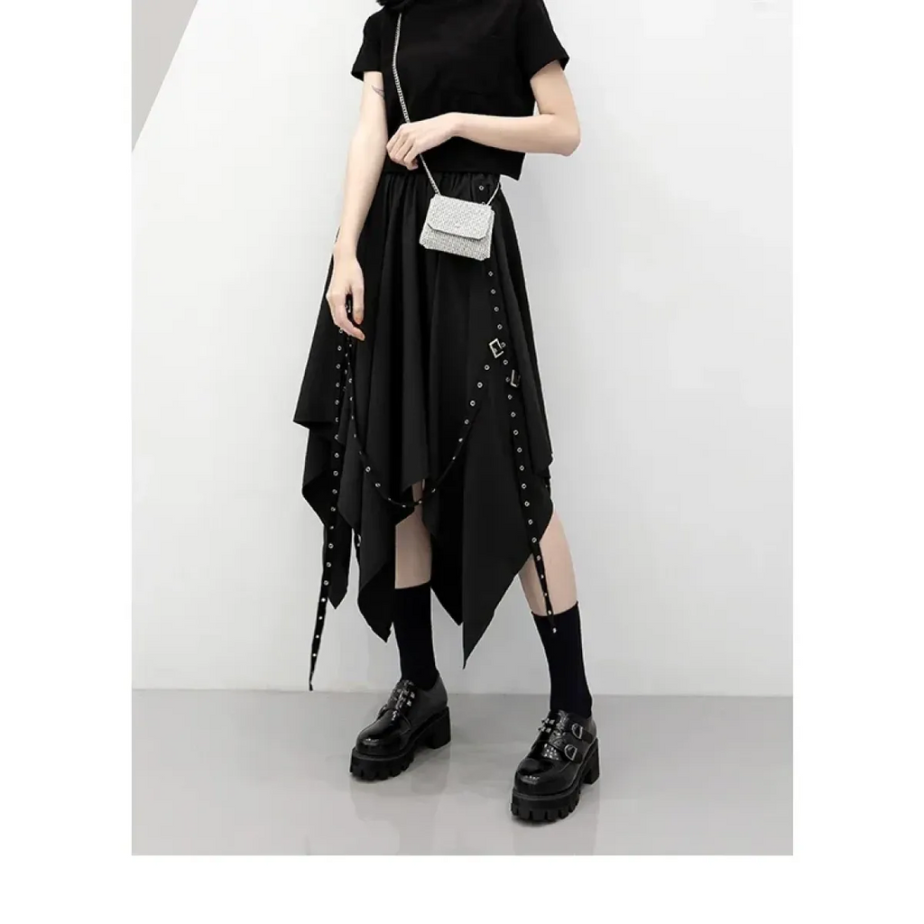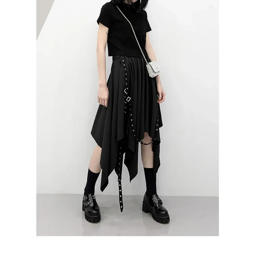 Unleash your inner shadow queen with the Black Irregular Hem Gothic Punk Skirt – a fierce fusion of dark romanticism and punk rebellion. This mid-calf, handkerchief-hem skirt turns every step into a dramatic statement, complete with buckle straps, grommet studs, and a bold A-line silhouette that flutters with edge.