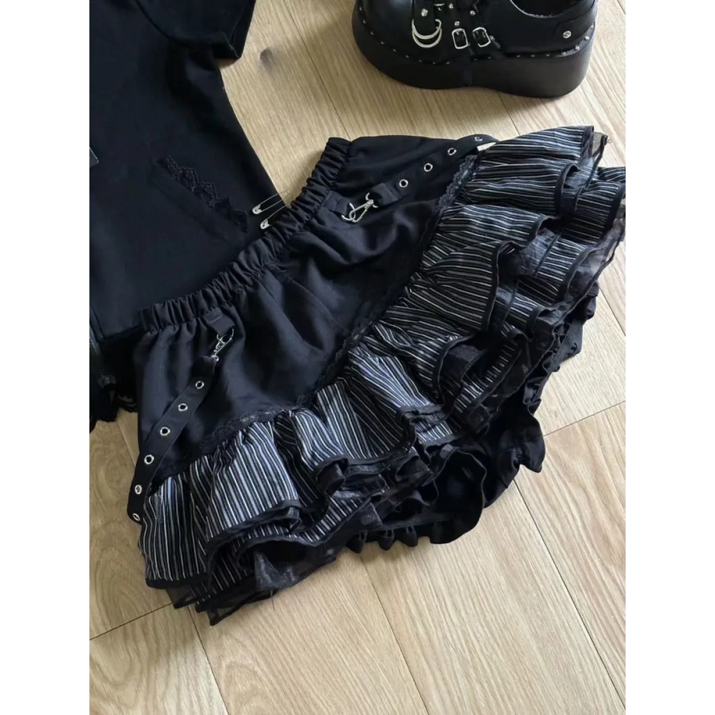 This punky mini skirt blends gothic elegance with Y2K edge, thanks to its layered ruffle design, lace details, and silver hardware accents. A must-have for standing out at concerts, cafés, or just living your alt fantasy!