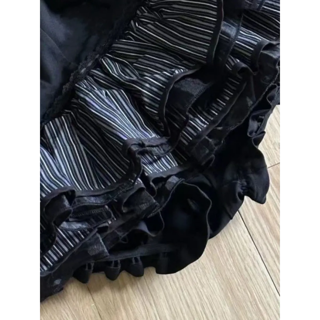 - Layered black and striped ruffle hemline