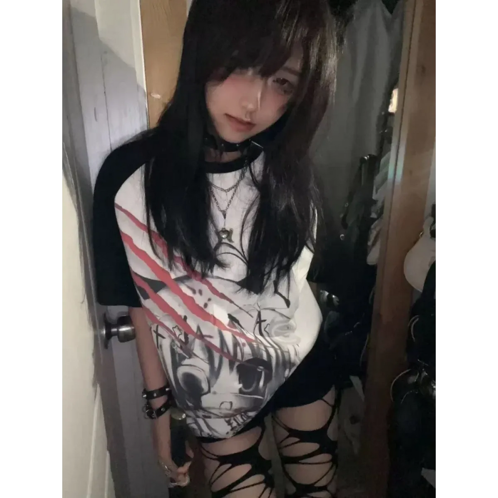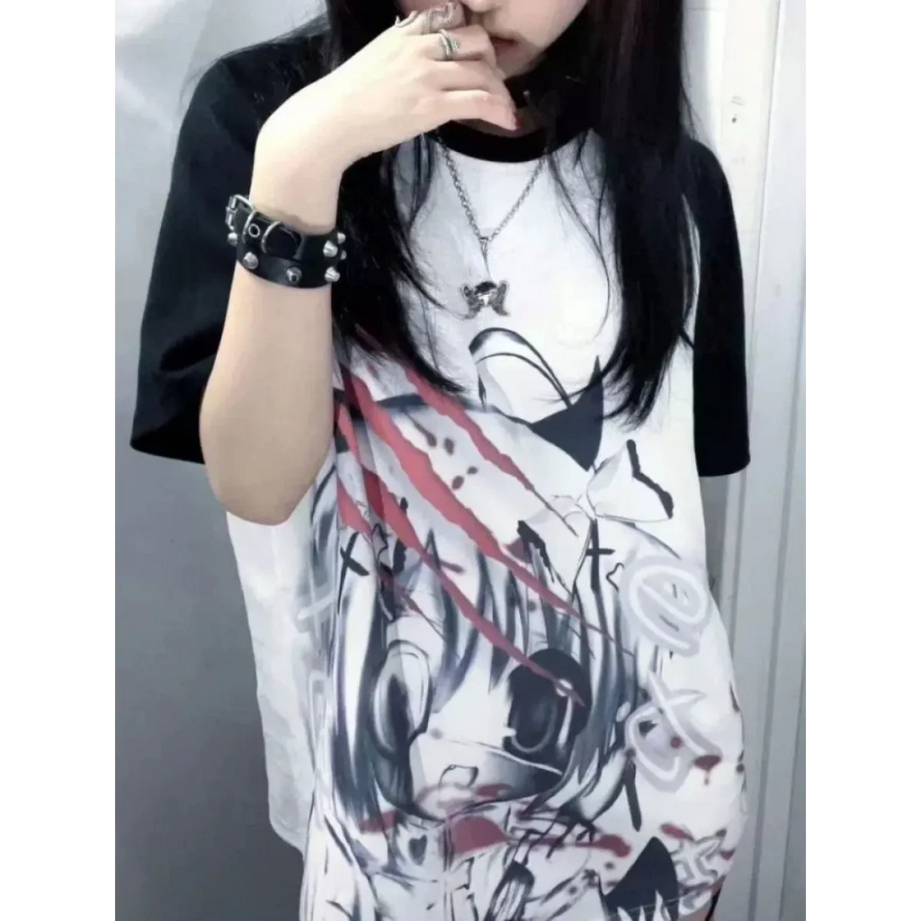Channel your inner goth with this bold anime-inspired graphic tee, perfect for lovers of edgy Harajuku streetwear and Y2K aesthetics. With its striking black-and-white design and relaxed fit, this top is as versatile as it is stylish! 🌙