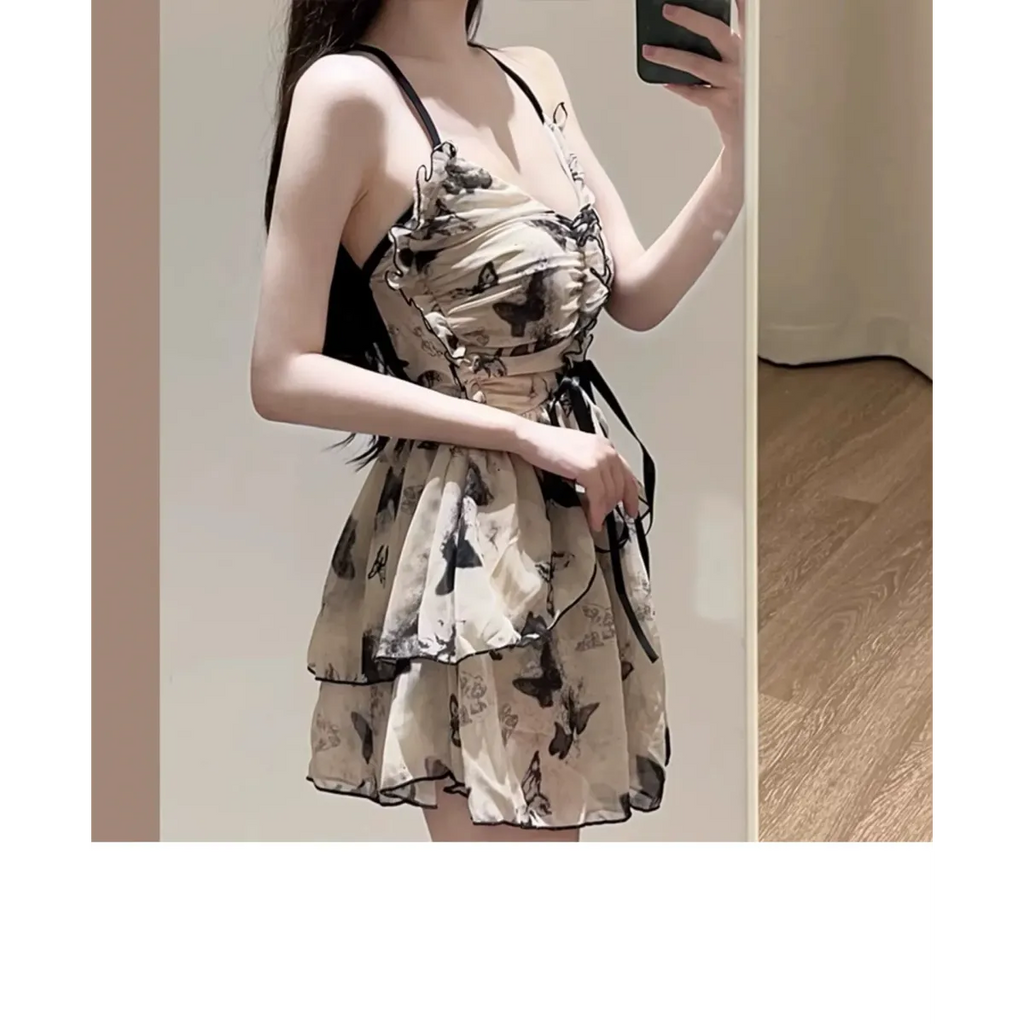 Pair the Butterfly Print One Piece Swimsuit – Vintage Ruffle Mini Dress Style with lace-trimmed socks, jelly sandals, and a transparent umbrella for a magical rainy day photo shoot—or throw on a crochet shrug and hit the boardwalk like a pastel princess!