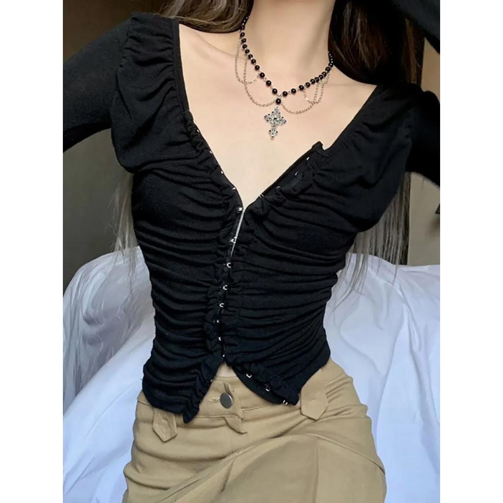 The low price casts some doubts. Do you save on the quality of the Coquette Aesthetic Ruched T-shirt with Front Hook Closures and O-neck?
