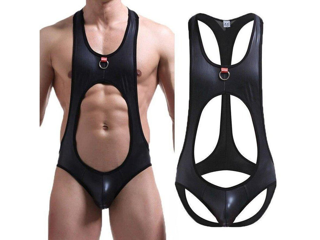 The perfect outfit for your intimate bedroom: Faux Leather Open Back Jockstrap Bodysuit. Let your inner wild side out in this sexy faux leather bodysuit and give your partner a night they won't forget! All the look with none of the leather stink-a night you can't put a price on. ;)