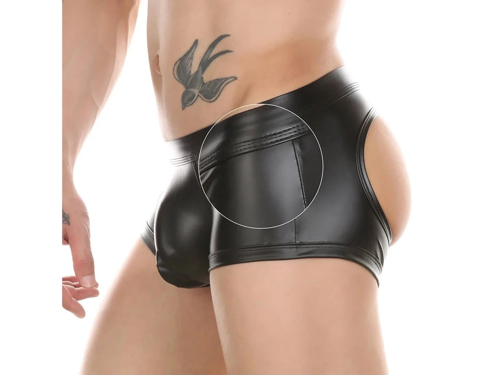 Make a statement with these daringly designed gay boxer briefs! These faux leather boxers feature uniquely hollowed buttocks that show off your shapely backside. Put yourself out there and be the star of the show!