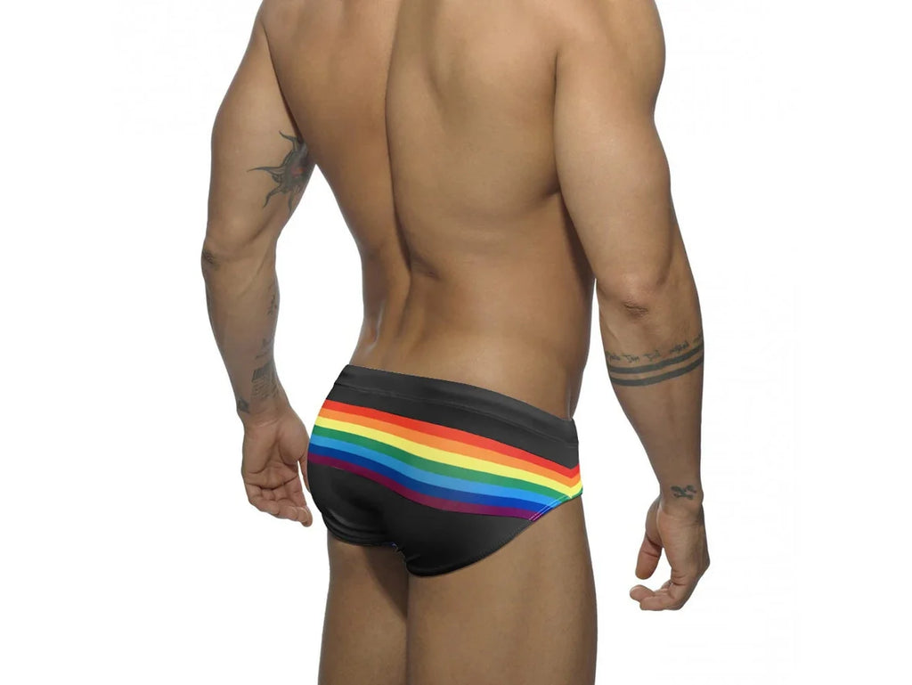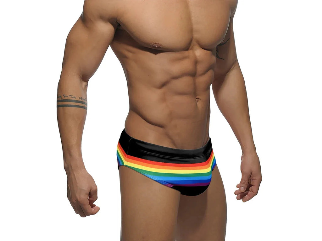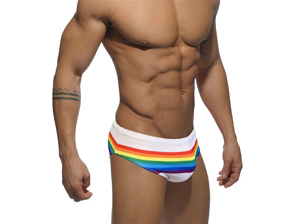 Add a splash of color to your swim wardrobe with our Gay Swim Briefs! These rainbow striped briefs not only make a statement but also give you a comfortable and flattering fit. Perfect for a day at the beach or pool, these briefs are a must-have for any fun-loving individual.