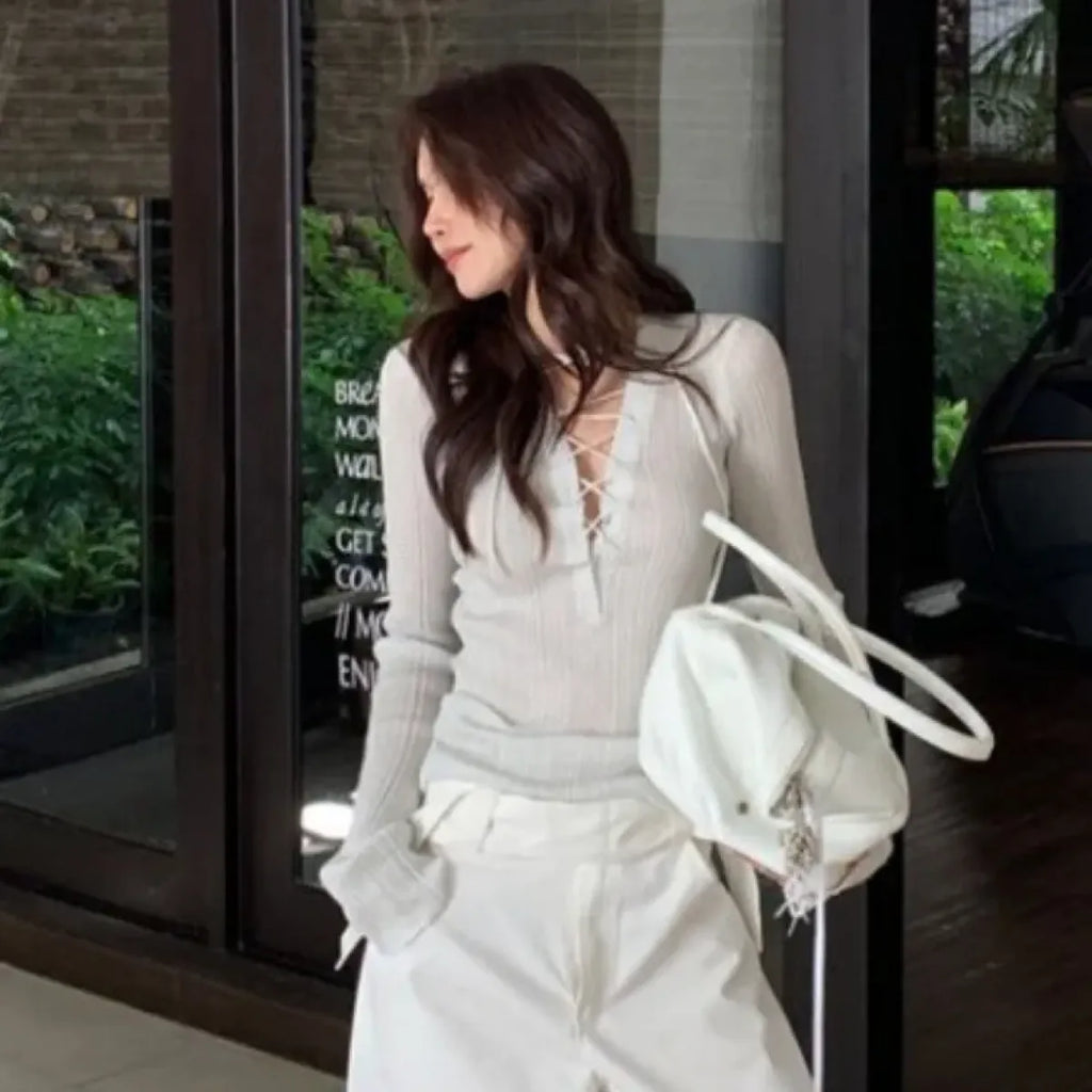 Let your inner fashion fairy shine in this lace-up long sleeve cutie! With a soft-touch knit and delicate lace-up detail, this top blends casual comfort with just the right amount of flirty flair. It's giving romantic Harajuku energy ✨—ready to charm from brunch dates to bubble tea runs!