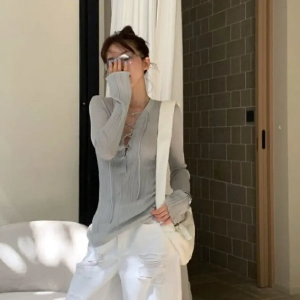 🌸 Why You’ll Love the Matakawa Lace-Up V-Neck Long Sleeve Tee