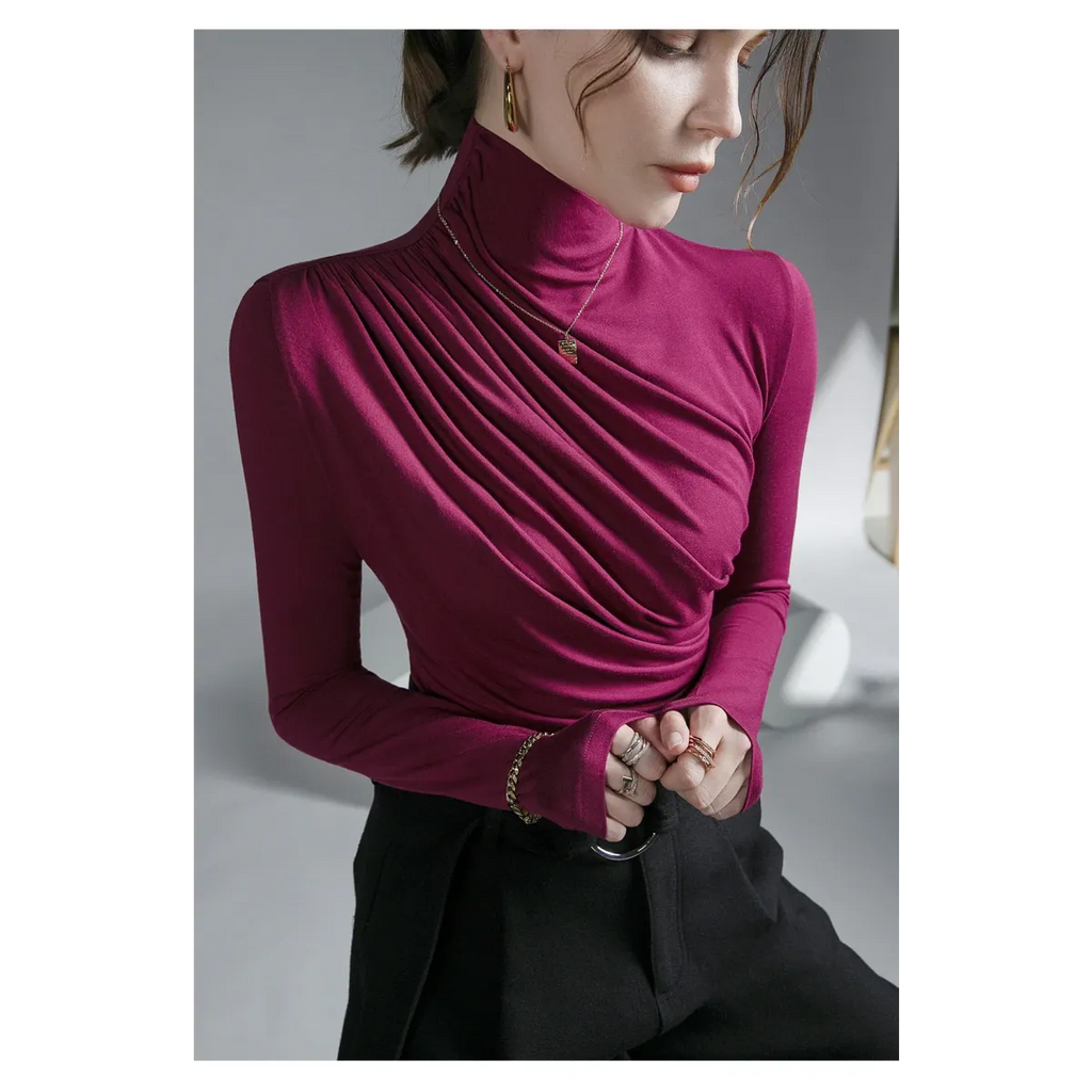 The Gothic Pleated Turtleneck Top brings together artful draping and moody sophistication with its soft stretch fabric and asymmetrical pleats. Its snug turtleneck and elegant silhouette make it a standout piece for cooler seasons.