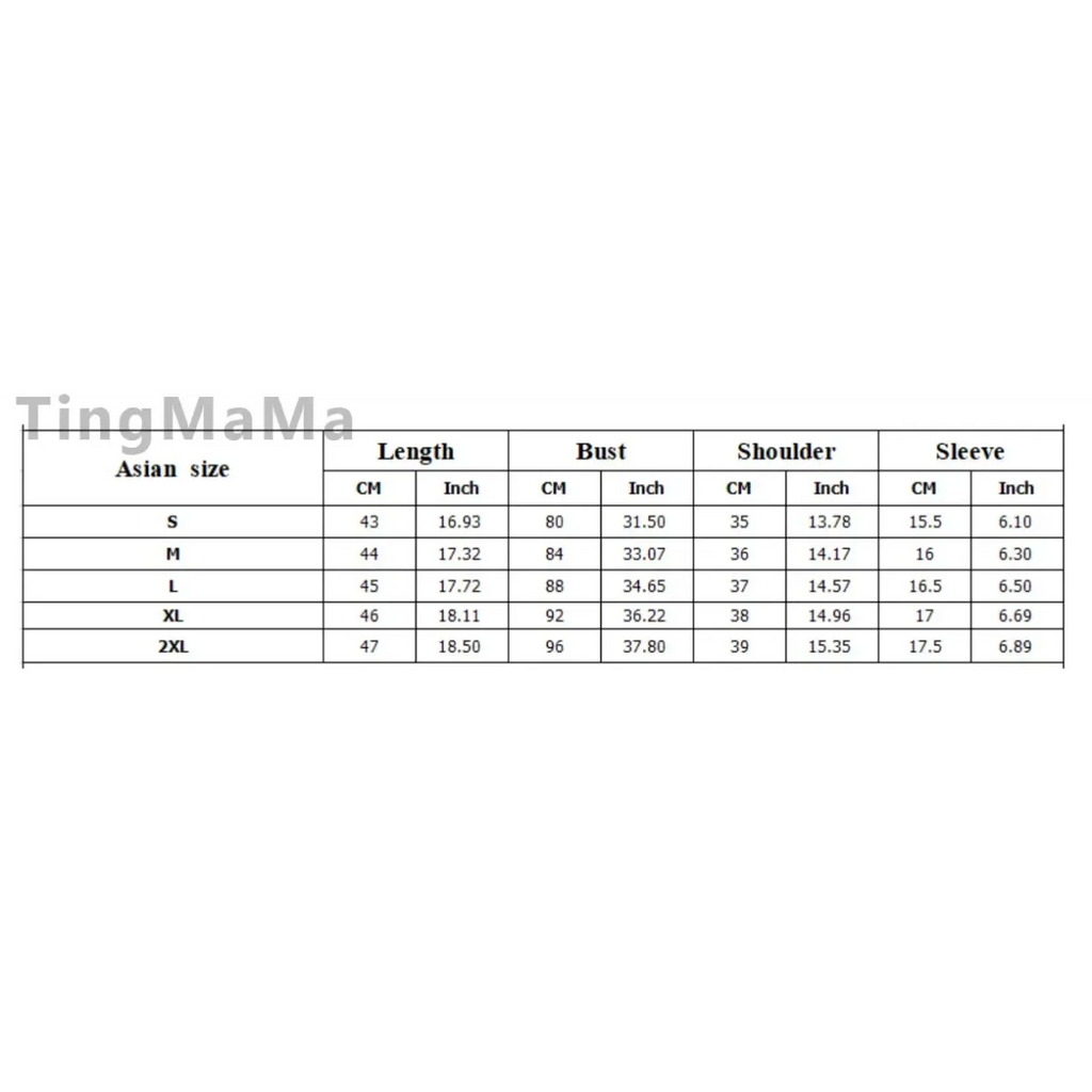 | Asian Size | Length (cm/inch) | Bust (cm/inch) | Shoulder (cm/inch) | Sleeve (cm/inch) |