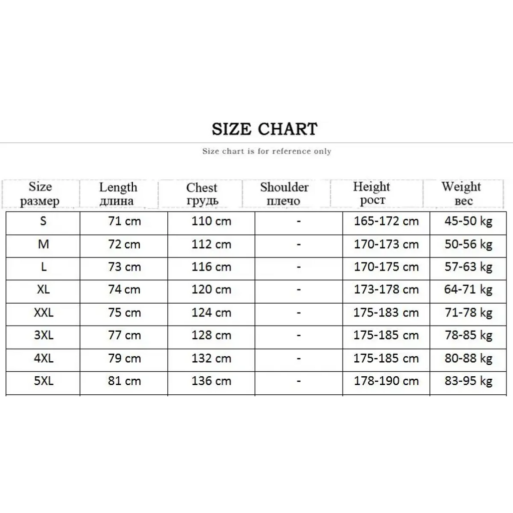 | Size | Length (cm) | Chest (cm) | Height (cm) | Weight (kg) |