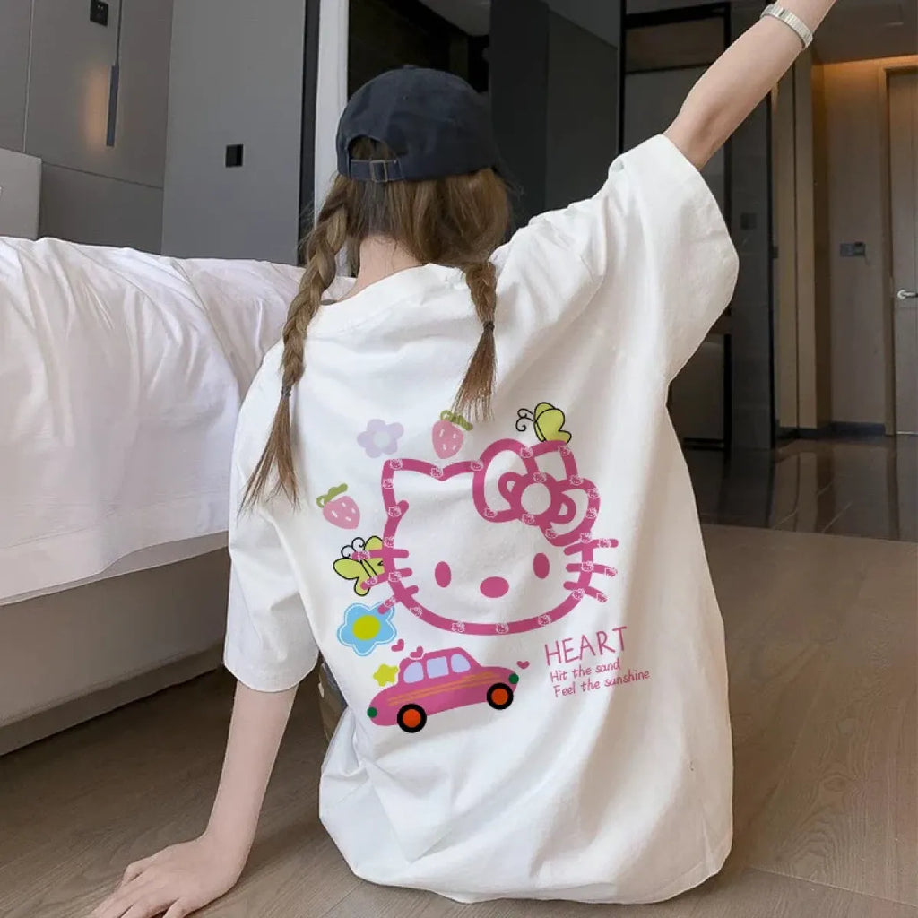 This adorable Harajuku Hello Kitty T-Shirt brings playful Y2K energy to your everyday wardrobe! Featuring a bold graphic of Hello Kitty with strawberries, butterflies, and a whimsical car, itβs the ultimate mix of cute and quirky for fans of Japanese street fashion.