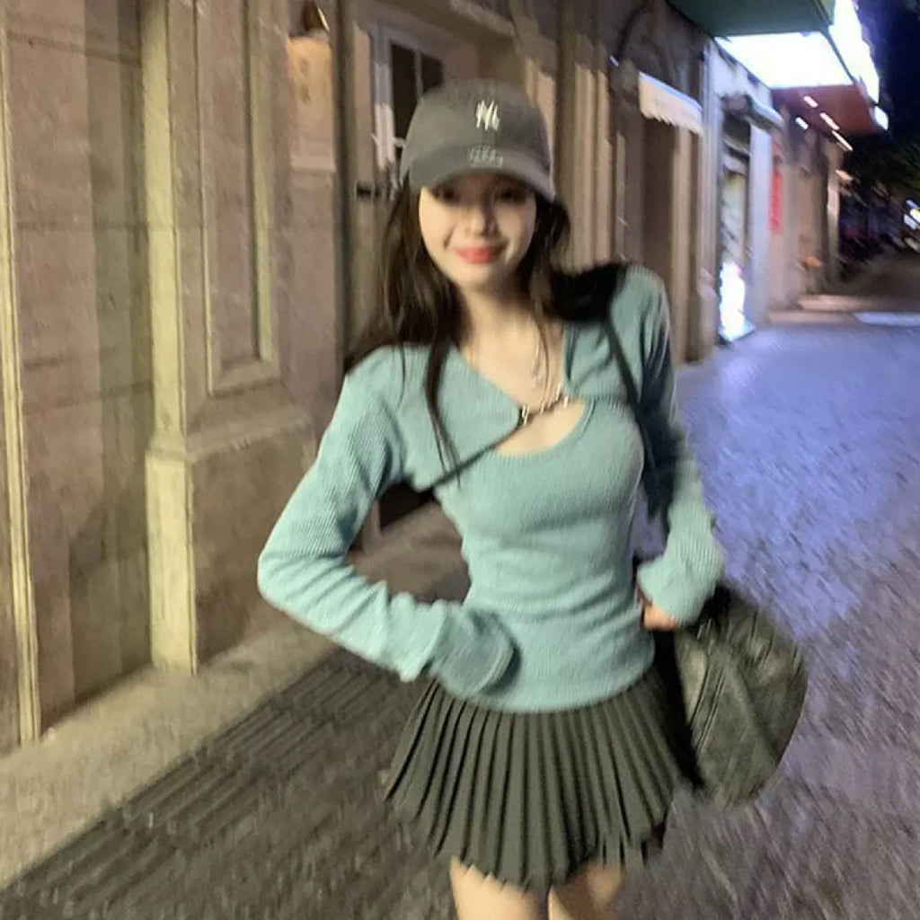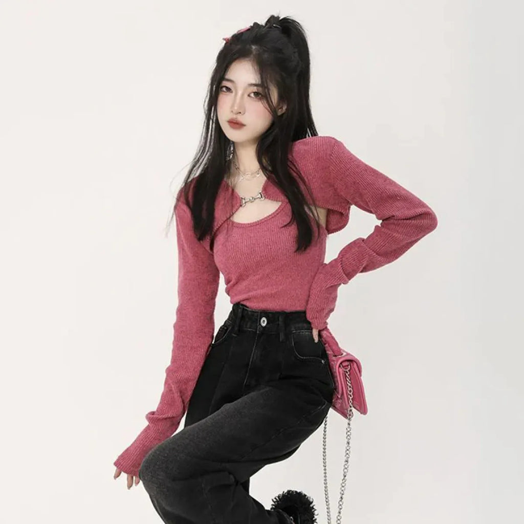 Pair this set with high-waisted jeans and chunky boots for an edgy Harajuku street look, or layer it over a pleated skirt and tights for a softer, café-date vibe. Add statement jewelry to elevate the neckline cutout!
