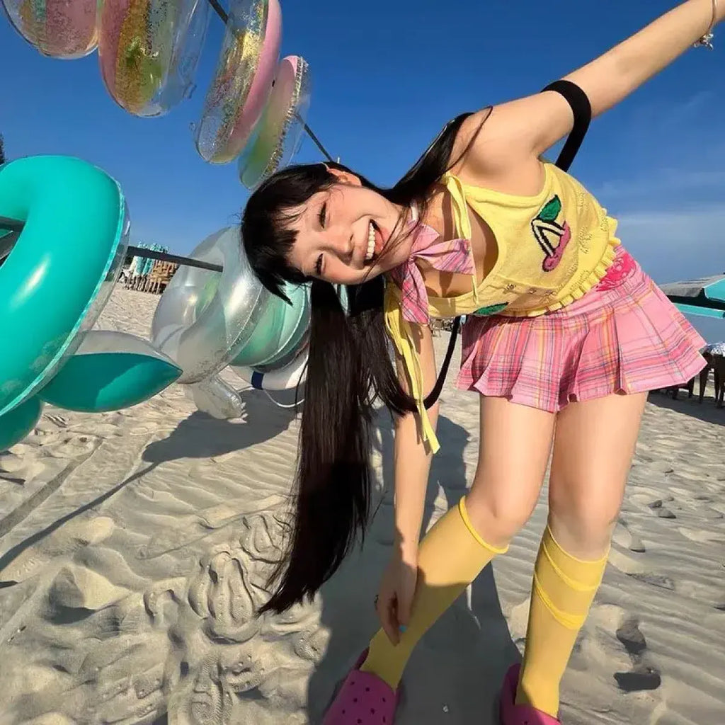 Match it with a cropped blouse, oversized cardigan, or pastel graphic tee. Finish your look with platform shoes, leg warmers, or statement socks for ultimate kawaii street style.