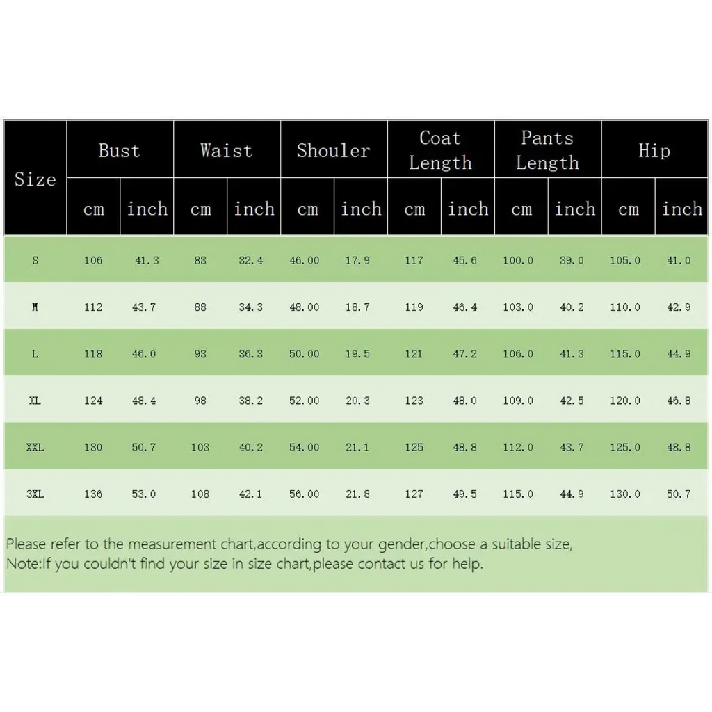 | Size | Coat Length (cm/inch) | Pants Length (cm/inch) |