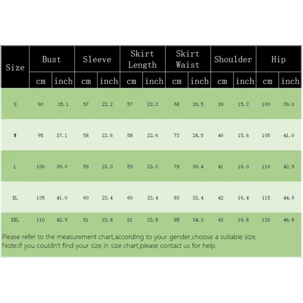 | Size | Skirt Waist (cm/inch) | Skirt Length (cm/inch) | Sleeve Length (cm/inch) | Hip (cm/inch) |