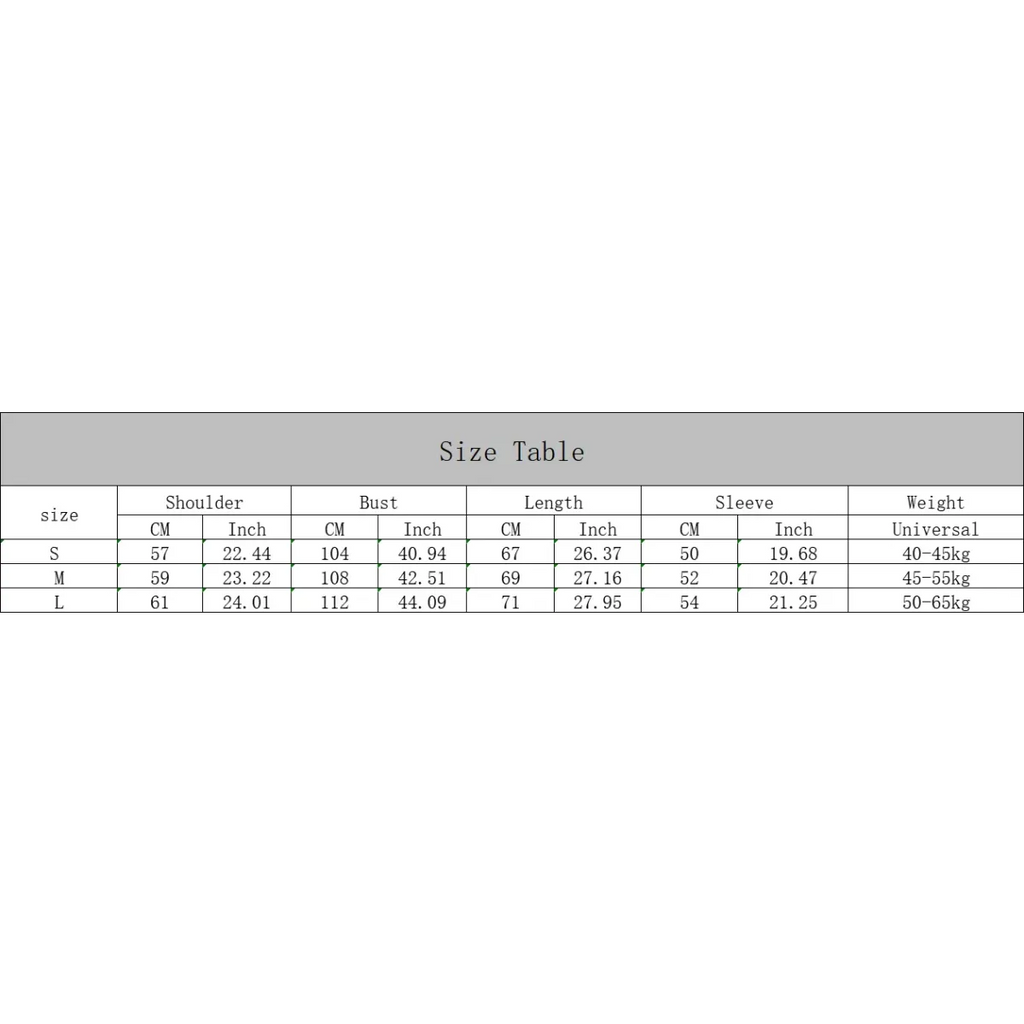 | Size | Shoulder (cm/in) | Bust (cm/in) | Length (cm/in) | Sleeve (cm/in) | Weight (kg) |