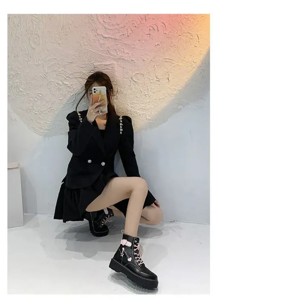 These Kawaii Platform Boots are the perfect statement piece for every fashion-forward cutie who loves mixing edgy vibes with sweet accents. Whether you're heading to a café date or just expressing your unique style, these boots are your new go-to. Snag your pair today and strut your stuff with confidence and cuteness!