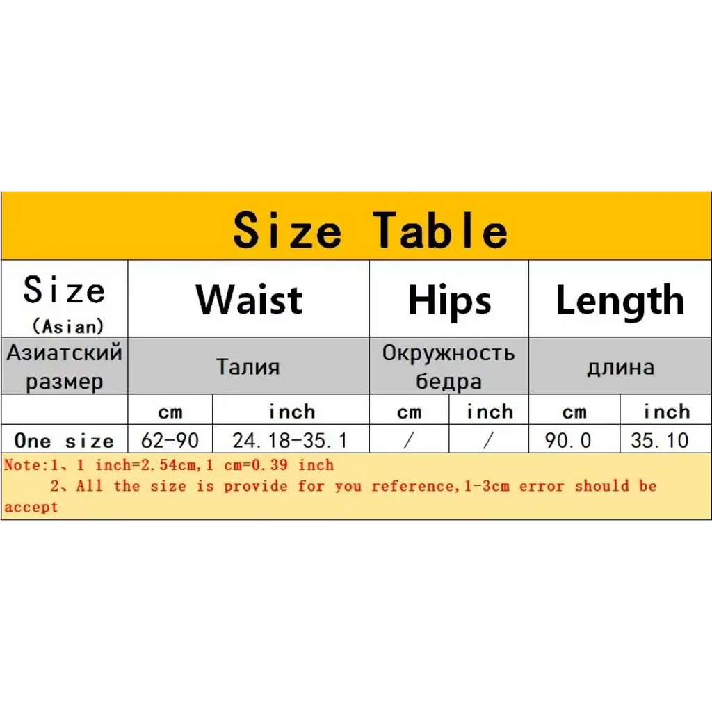 One size (Asian sizing): Waist 62–90cm (24.18–35.1in). Please allow 2–3cm variation due to manual measurement. Non-stretch fabric. Refer to chart below for details: