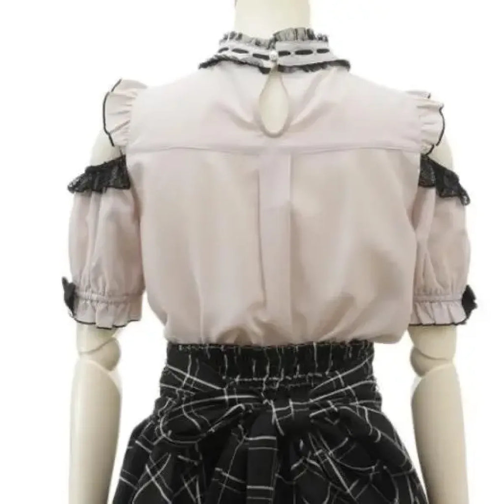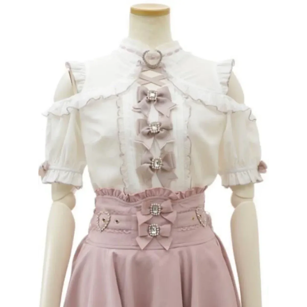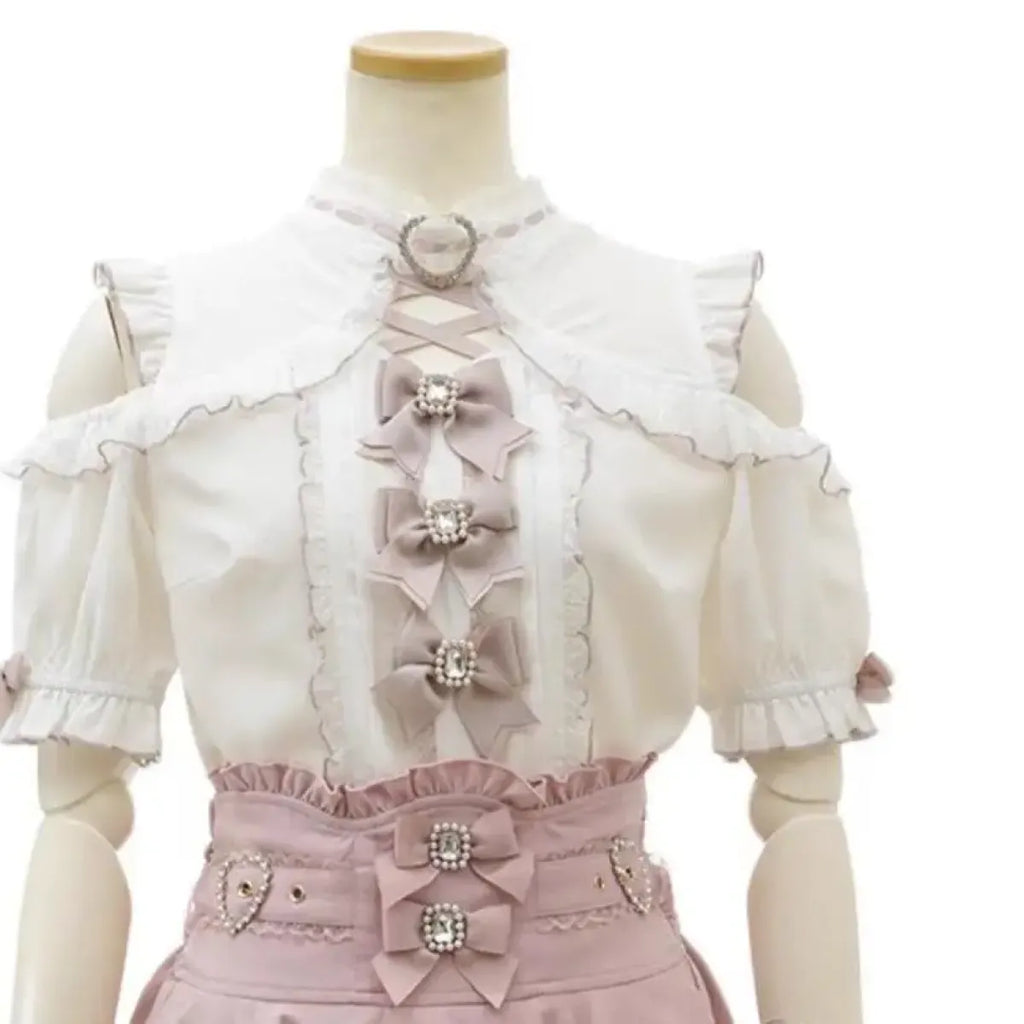 This delicate off-shoulder blouse blends aristocratic charm with kawaii elegance, thanks to its intricate lace, cascading black bows, and soft pastel fabric. It's the perfect blend of dark romance and doll-like sweetness.