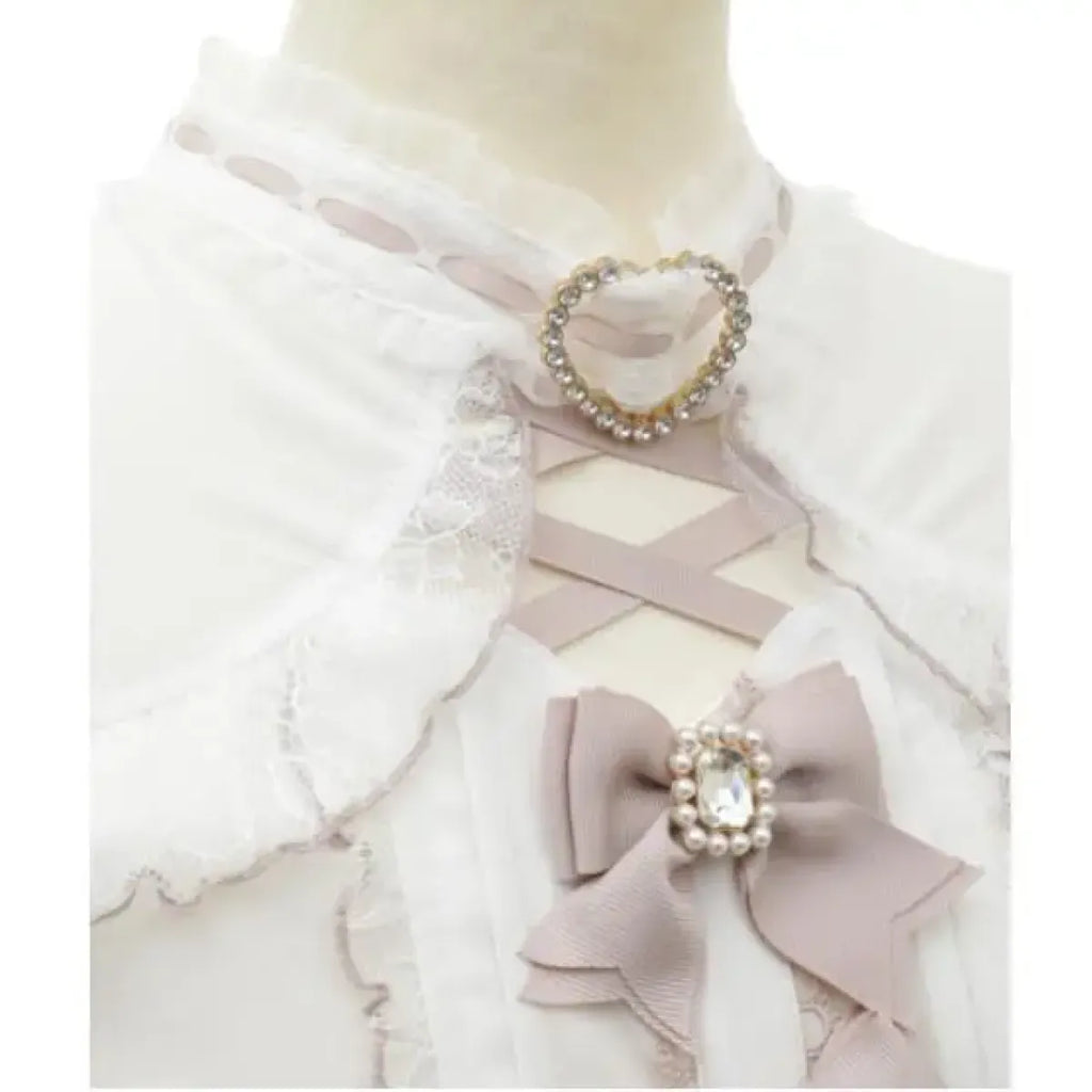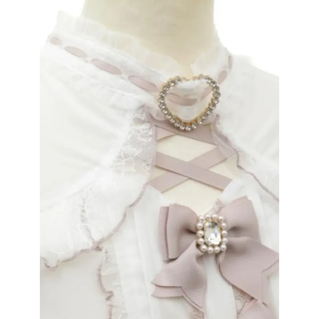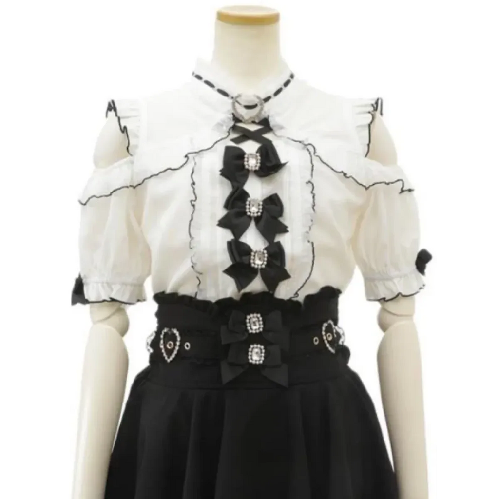 This delicate off-shoulder blouse blends aristocratic charm with kawaii elegance, thanks to its intricate lace, cascading black bows, and soft pastel fabric. It's the perfect blend of dark romance and doll-like sweetness.