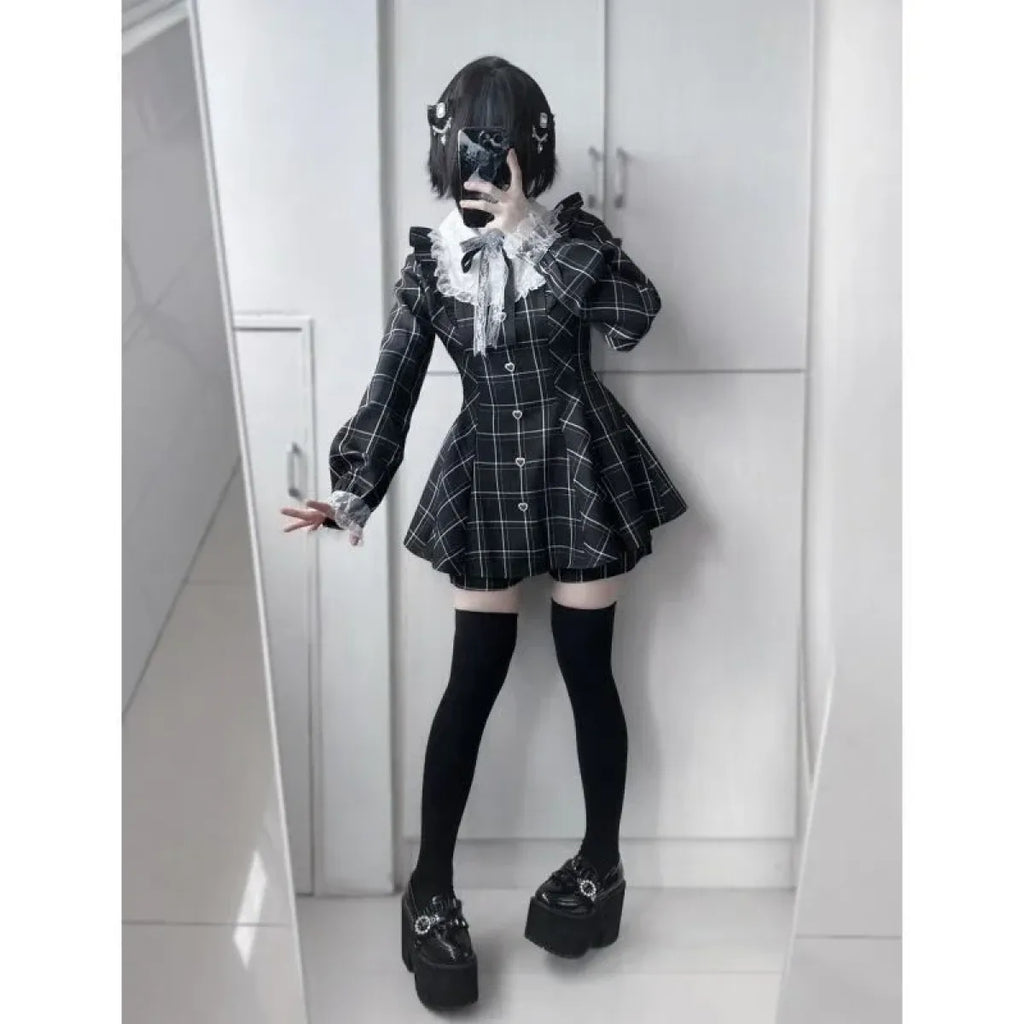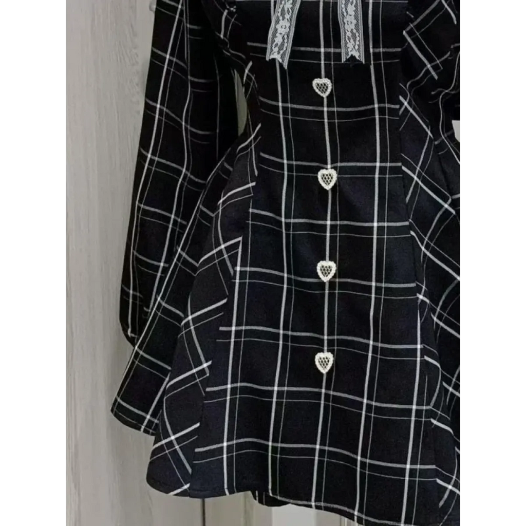 This charming plaid dress blends a classic schoolgirl aesthetic with the dreamy details of Lolita fashion—think lace-trimmed collar, frilly bowtie, and heart-shaped buttons that make every outfit feel extra special.