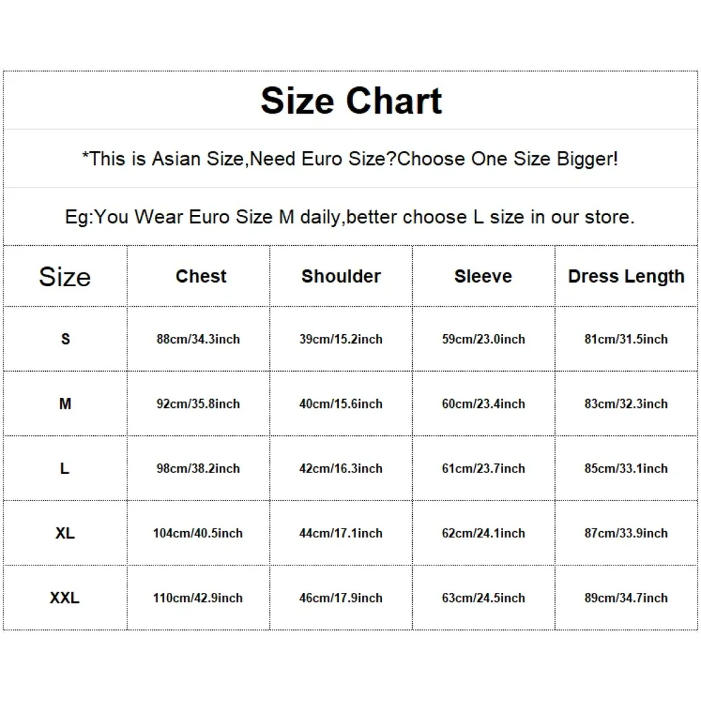| Size | Chest (cm/in) | Shoulder (cm/in) | Sleeve (cm/in) | Dress Length (cm/in) |