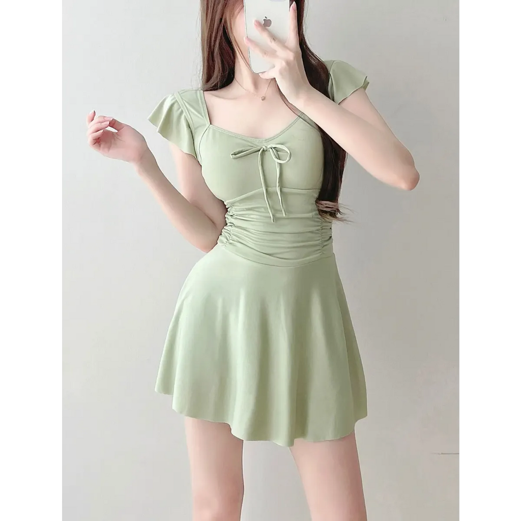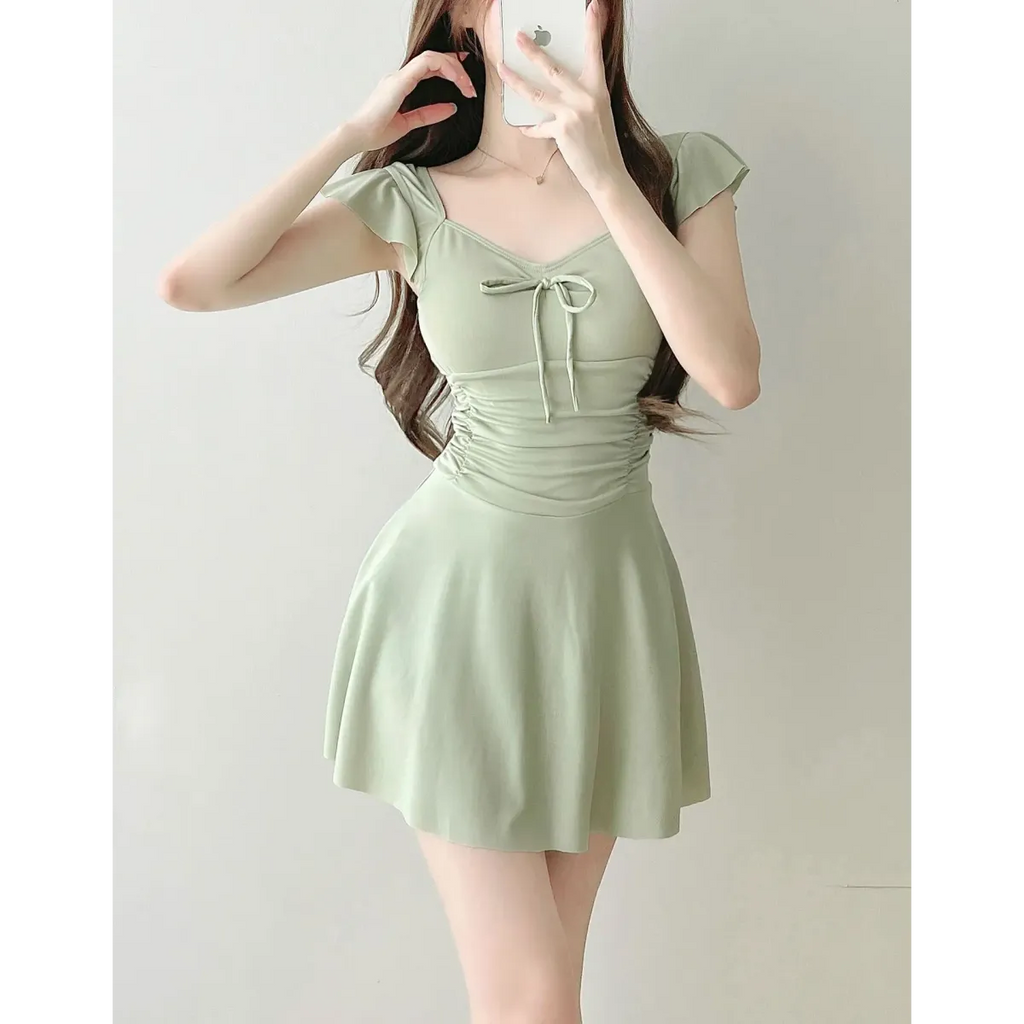 Ready to serve cottagecore realness at the pool? The Mauve Ruffle Sleeve One Piece Swimsuit – Bow Detail Mini Dress Style is here to steal hearts. With fluttery ruffle sleeves, a soft bow accent, and a delicate mini-dress silhouette, this one-piece is the perfect mix of playful and polished. Whether you're lounging in a garden or floating through beachside daydreams, this Japan-style swimsuit brings pure pastel magic.