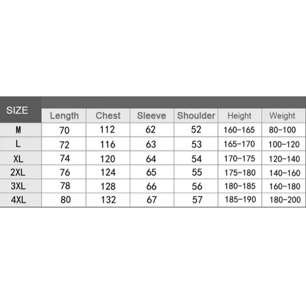 | Size | Length (cm) | Chest (cm) | Sleeve (cm) | Shoulder (cm) | Height (cm) | Weight (kg) |