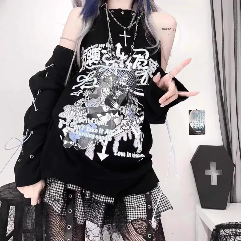 Unleash your dark and edgy side with this gothic anime print long-sleeve tee! Featuring bold graphics, a classic O-neck design, and a relaxed yet flattering fit, this top is perfect for alternative fashion lovers who want to make a statement. Whether you're rocking it with a full goth aesthetic or adding a touch of anime-inspired streetwear to your look, this tee is a must-have for spring, summer, and beyond.