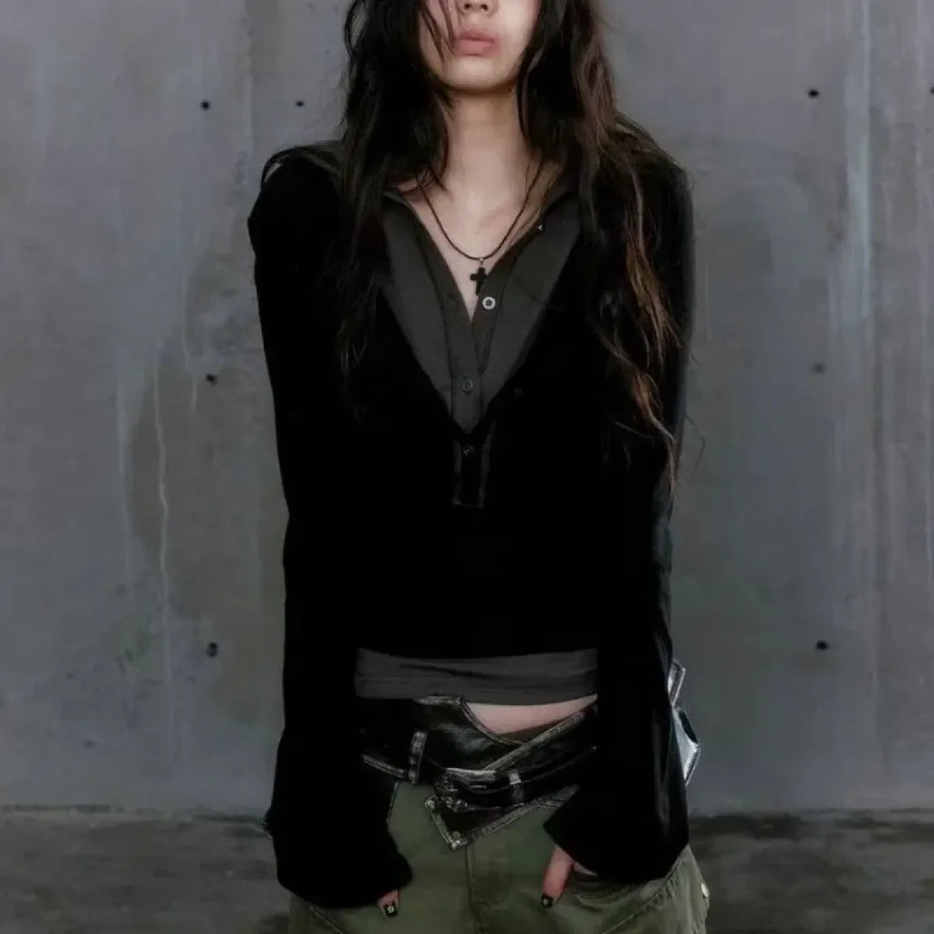 💖 Why You’ll Love the Patchwork Hooded Top – Y2K Cyber Grunge Slim Fit Knit Pullover