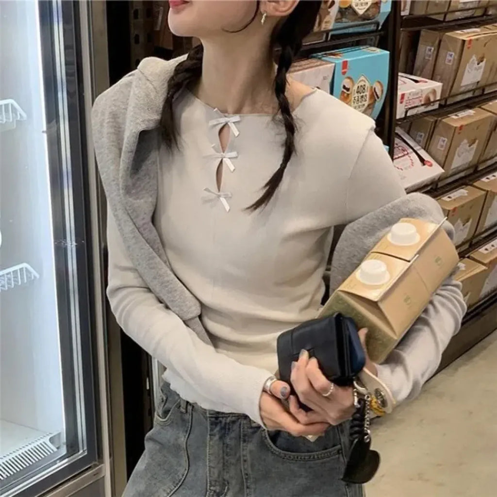 💖 Why You’ll Love the Ribbed Bow Tie Knit Top – Y2K E-Girl Slim Fit Long Sleeve Tee
