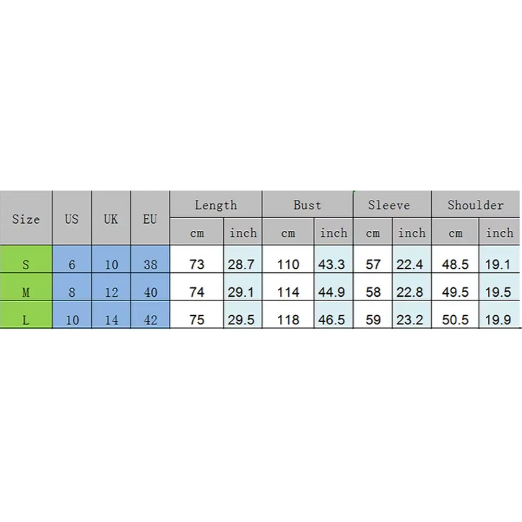 | Size (US) | Length (in) | Bust (in) | Sleeve (in) | Shoulder (in) |