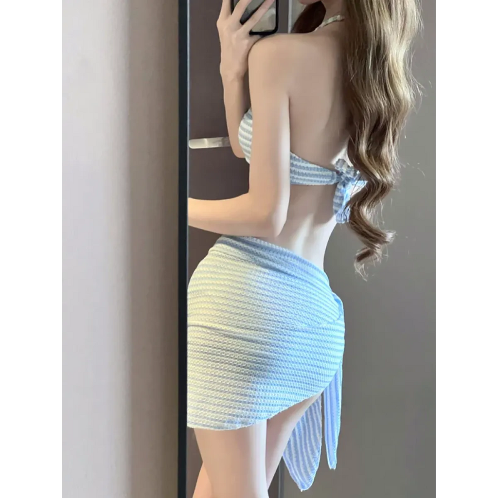 Turn every beach day into a dreamy fashion moment with the Striped 4-Piece Bikini Set. Featuring a breezy halter top, matching mid-waist bottoms, a light-as-air sarong, and a coordinating cover-up, this pastel blue set is your go-to for effortless coastal cuteness. The textured knit pattern adds depth to the soft stripes while the wire-free top offers comfy support without compromising style.