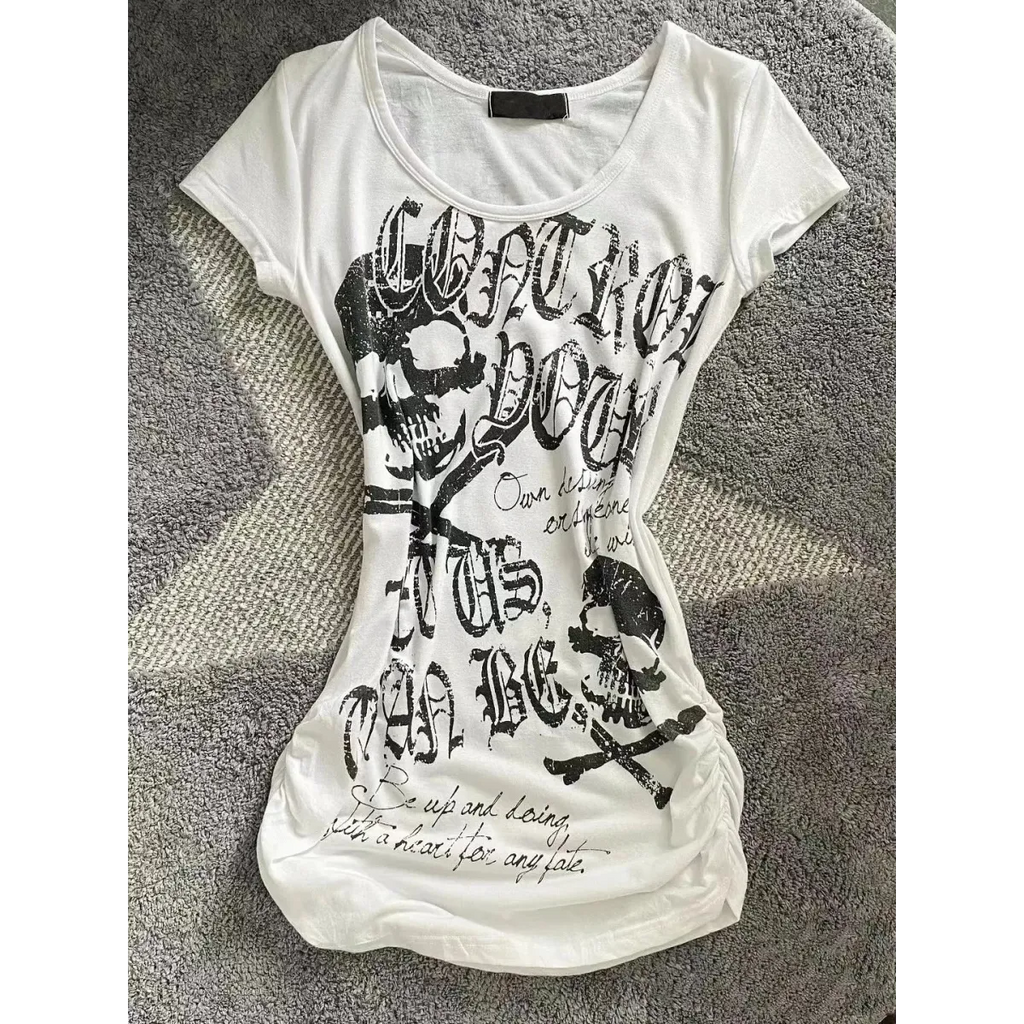 This Gothic Skull Tee is a must-have for lovers of dark fashion. The longline silhouette and bold skull print make it a standout piece whether you’re dressing up for an event or adding a rebellious twist to casual looks.